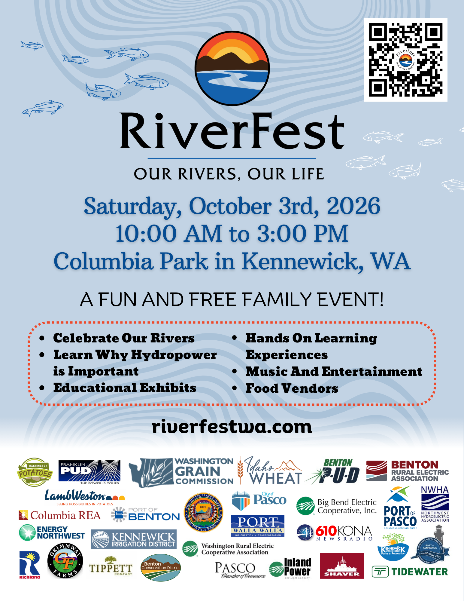 Businesses, community organizations and people of all walks of life throughout the region have joined together to host RiverFest 2025. RiverFest is a FREE, fun, and educational family event, featuring exhibitors, vendors, and entertainment to showcase all the benefits of the Federal Columbia River Power System and highlight the four lower Snake River dams including navigation, irrigation, recreation and power. People of all ages will find something fun to do and learn about at RiverFest!
